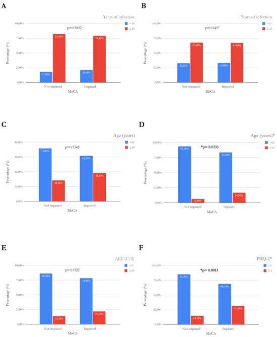 Cognitively impaired vs non-impaired subjects; ALT, Alanine aminotransferase; MoCA, Montreal Cognitive Assessment; PHQ-2, Patient Health Questionnaire—two items. p-value refers to blue bars. “*” indicates a significant p-value. (A) Comparison of subjects (percentages) with normal or deficient MoCA scores, to the duration of infection (less than or equal/greater than 10 years) (B) Comparison of subjects (percentages) with normal or deficient MoCA scores, to the duration of infection (less than or equal/greater than 15 years); (C) Comparison of subjects (percentages) with normal or deficient MoCA scores, to age (less than or equal/greater than 60 years); (D) Comparison of subjects (percentages) with normal or deficient MoCA scores, to age (less than or equal/greater than 65 years); (E) Comparison of subjects (percentages) with normal or deficient MoCA scores, to ALT (less than or equal/greater than 35 U/L); (F) Comparison of subjects (percentages) with normal or deficient MoCA scores, to PHQ-2 score (less than or equal/above 3).