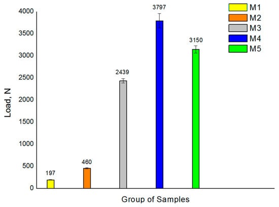 Figure 2. Compression test results for the 5 samples analyzed. Values presented correspond to the mean maximum load at fracture with its standard deviation.