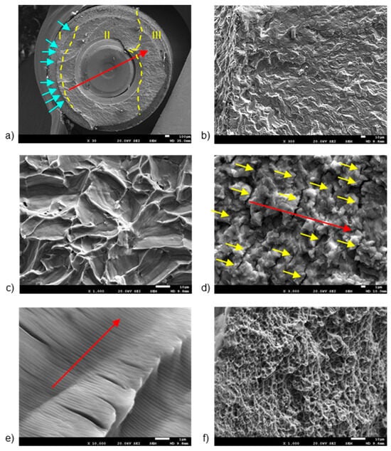 Figure 3. SEM images of fractured implants, detailing: (a) fracture regions, (b) multiple crack initiation points, (c) trans-granular fracture, (d) secondary cracking, (e) fatigue striations, and (f) micro-cavities or “dimples”. The dashed lines are the division of the different fatigue zones. The first one is the crack nucleation (zone I), the middle one is the crack propagation zone (zone II) and the last one is the ductile fracture (zone III). The arrows indicate the crack initiation zone. The scale bars are located at the lower right corner of the images, with values of 1 µm (d,e), 10 µm (b,c,f), and 100 µm (a), respectively.