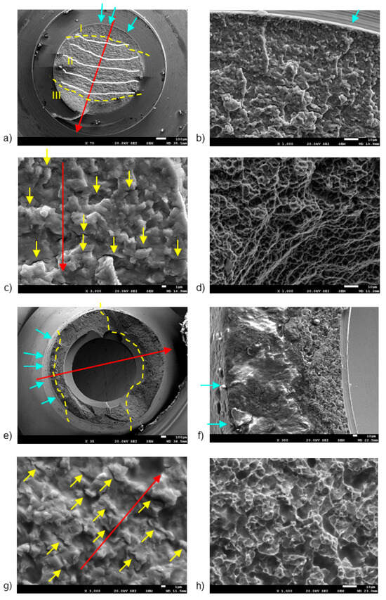 In the abutment, region I displayed a few crack initiation points, marked by blue arrows in Figure 4e. Notably, Region I showcased a smooth finish due to the rubbing contact between the crack surfaces under cyclic loading, resulting in a burnished appearance (Figure 4f) [17,37]. Region II displayed characteristic secondary cracks, marked by yellow arrows in Figure 4g.