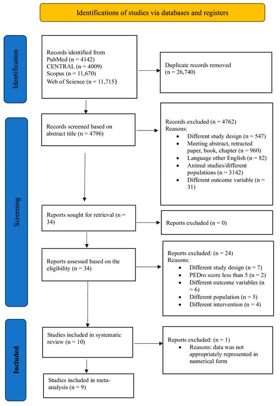 In the systematic review and meta-analysis, the identification of studies began with a comprehensive search across multiple databases, leading to the initial identification of 31,536 articles (Table 1). Following the removal of 26,740 duplicate records, 4796 articles were screened based on titles and abstracts. Out of 4796 articles, 4762 articles were excluded due to various reasons such as incompatible study design (n = 547 articles); non-original reports like meeting abstracts, retracted papers, or book chapters (n = 960 articles); language barriers excluding non-English studies (n = 82 articles); the inclusion of animal studies or different target populations (n = 3142 articles); and research with divergent outcome variables (n = 31 articles). Consequently, this refinement process yielded 34 articles that were subjected to detailed full-text analysis based on eligibility criteria, leading to the further exclusion of 24 articles for various reasons such as different study designs (n = 7), PEDro scores less than 5 (n = 2), outcomes other than our inclusion criteria (n = 6), different populations (n = 5), and different interventions (n = 4). Ultimately, 10 articles met all the criteria for inclusion in our systematic review. However, one of these was omitted from the meta-analysis because it did not present quantifiable data adequately. As a result, nine studies were ultimately included in the meta-analysis (Figure 1).
