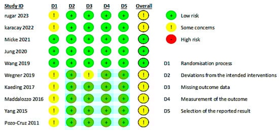 Deviations from Intended Interventions: This area assesses the consistency and adherence to the intervention protocols. Remarkably, all included studies showed a low risk of bias in this domain, suggesting that the interventions were delivered as planned [16,18,23,41,42,43,44,45,46,47].