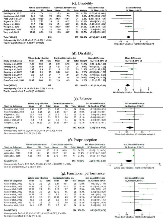 Disability: Disability evaluation in our study involved the ODI and the RMDQ. Specifically, seven studies [16,23,42,43,45,46,47] utilized the ODI. Wang et al. (2019) provided their findings in means and confidence intervals, which were converted to mean and standard deviation for uniformity in analysis [23]. Additionally, Ruger et al. (2023) presented a comparative analysis of WBVE against two other treatments, necessitating an individualized approach for the meta-analysis [45]. Three studies [16,18,42] employed the RMDQ, with Cigdem Karacay et al. (2022) offering data at both post-treatment and three months post-treatment, enriching our longitudinal insight into disability outcomes.