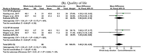 Relevant data for the outcome measures were extracted from all study groups at both the beginning and the end of the intervention by the two authors (TZ and SN), covering key outcome measures. Initial data points were collected, including the number of participants (n), mean, standard deviation, p-value, and 95% confidence intervals (CI), when available. For further analysis, Review Manager (RevMan 5.4, provided by The Cochrane Collaboration) was utilized. Due to the consistent methodology across studies for certain outcomes, a fixed-effect model was applied to compute mean differences (MDs) for QoL (SF-36), and disability scores [Oswestry disability index (ODI) and Roland–Morris disability questionnaire (RMDQ)], along with their 95% CIs. Conversely, for outcome measures like progressive iso-inertial lifting evaluation (PILE), visual analog scale (VAS), numerical pain rating scale (NPRS), balance and proprioception, where methodological approaches varied, a random-effects model was employed. This is per recommendations to perform a meta-analysis [39]. The effect size of the outcome variables was interpreted by the MD or SMD values, with a value of 0.2 signifying a small effect size, 0.2–0.5 depicting a medium effect size, and >0.5 reflecting a high effect size according to Cohen’s criteria [40]. The heterogeneity among studies was assessed using the I2 statistic, where heterogeneity was interpreted as low (0–40%), moderate (30–60%), high (50–90%), and very high (75–100%), ensuring a comprehensive evaluation of variability among study findings [39]. A value of p < 0.05 was considered statistically significant. This methodological approach ensures a robust analysis of the treatment effects of WBV on the specified outcomes, facilitating a comprehensive understanding of its efficacy and applicability in clinical settings.