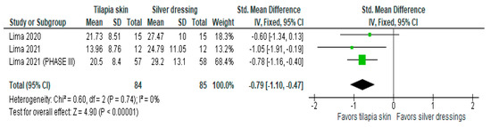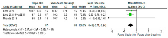 Of the four studies [3,11,13,15] that evaluated re-epithelialization, three [3,11,13] used mean and SD to report the data, and one [15] exposed the result imprecisely (10 to 11 days). The three studies were included in the meta-analysis to assess re-epithelialization in burn patients using tilapia skin (Figure 2), the results of which showed a significantly lower mean compared to those treated with silver-based dressings (MD −0.48 (95% CI −0.71, −0.24), p value < 0.0001% and heterogeneity verified using the I2 test = 0%).