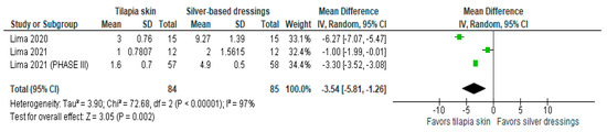 Of the four studies [3,11,13,15] that evaluated the number of dressing changes, two [11,13] compared Nile tilapia skin with 1% silver sulfadiazine cream, changing dressings in the intervention group if there was a failure in the adhesion to the wound bed and in the control group every 24–48 h. The results were expressed as mean and SD. The results of the study showed less need for dressing changes when tilapia skin was used compared to silver-based dressings (MD −3.54 (95% CI −5.81, −1.26), p-value = 0.002% and heterogeneity verified using the I2 = 97%) (Figure 4).