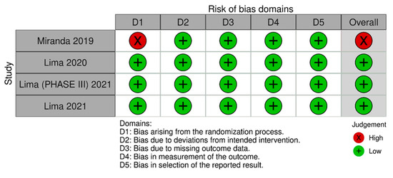Risk of bias domains 2. In this analysis, we included: Miranda [3], Lima [13], Lima [14] and Lima [15].