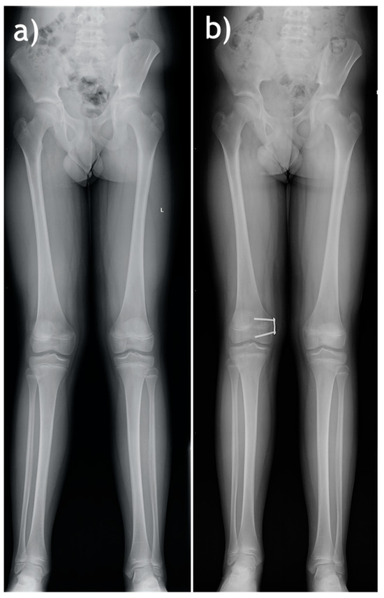 Pediatric lower limb deformities are a considerable problem for orthopedic surgeons [1,2,3,4,5,6,7,8,9,10,11,12,13,14,15,16,17,18,19,20,21,22,23,24]. Genu valgum or varum may cause limping, pain, knee or patellar instability, gait disturbances, limited mobility, articular cartilage damage, accelerated joint degeneration, rapid fatigue, sports and physical activity limitations, meniscal injury, and cosmetic concerns [1,2,3,4,5,6,7,8,9,10,11,12,13,14,15,16,17,18,24]. Genu valgum or varum deformity treatment is indicated in cases with a mechanical axis deviation (MAD) of >10 mm or the inter-malleolar distance of >8 cm, or an angular deformity of >10° [1,3,7,11,12,14,16]. Since conservative treatment methods (rehabilitation, exercises, insoles, orthoses, plaster casts) for pediatric lower limb deformities are ineffective, surgical treatment is recommended in this patient population [1,2,3,4,5,6,7,8,9,10,11,12,13,14,15,17,22,23]. The techniques of pediatric lower limb deformity correction include the Ilizarov method osteotomy, osteotomy with plate fixation, osteotomy with external fixation, and hemiepiphysiodesis with the use of stapling or an O-plate (also known as an eight-plate) [1,2,3,4,5,6,7,8,9,10,11,12,13,14,15,16,17,18,19,20,21,22,23,24]. Hemiepiphysiodesis is indicated for smaller deformities (less than 11 degrees) and in patients aged approximately 0.5–2 years prior to the predicted growth plate fusion or at an age of 14–16 years [6,7,8,10,11,14]. Due to the limitations and lower effectiveness of hemiepiphysiodesis, in the case of larger deformities (exceeding 12 degrees) and in older patients over 14–16 years of age, it is recommended to perform osteotomy with plate fixation or osteotomy with external fixation [6,7,8,10,11,14]. Hemiepiphysiodesis is a minimally invasive, quick, inexpensive method with good treatment outcomes and low complication rates; therefore, it has been widely adopted worldwide [1,2,3,4,6,7,8,9,10,11,12,13,14,15,18,21,22].