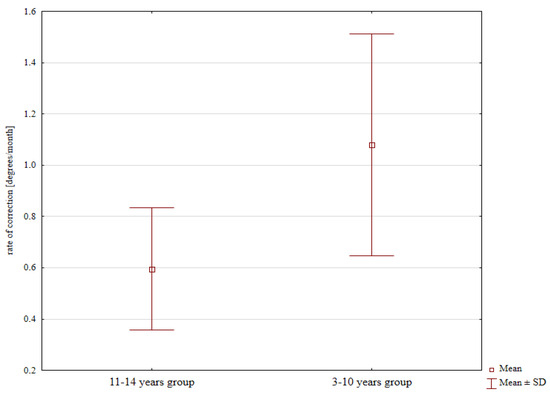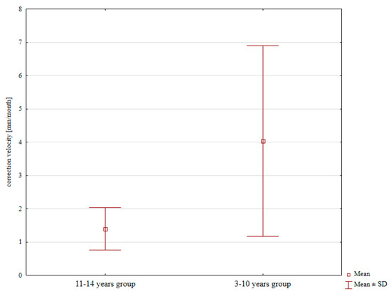 The mean correction velocity was 1.23 mm/month in females and 2.46 mm/month in males, with the difference not significant. However, the difference in mean correction velocity between 3–10-year-old children (4.03 mm/month) and that in 11–14-year-old children (1.39 mm/month) was statistically significant; p = 0.031; Figure 2.