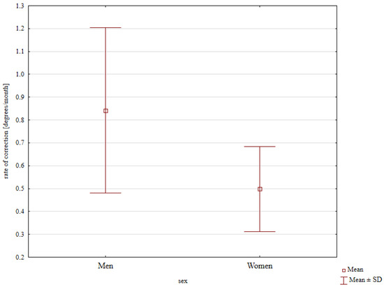 The mean rate of correction was 0.49°/month in females and 0.89°/month in males, with the latter rate significantly greater; p = 0.023; Figure 3. Moreover, the difference in the mean rate of correction between the younger (1.08°/month) and the older subgroup (0.59°/month) was also significant; p = 0.018; Figure 4.
