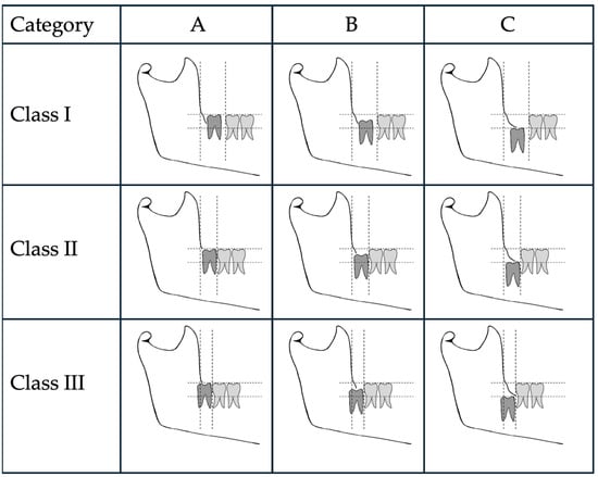 13]. Classes IIIA, IB, IIB and IIIB of the original Pell and Gregory categorization were included, thus excluding fully erupted potentially functional and fully impacted third molars. This classification (