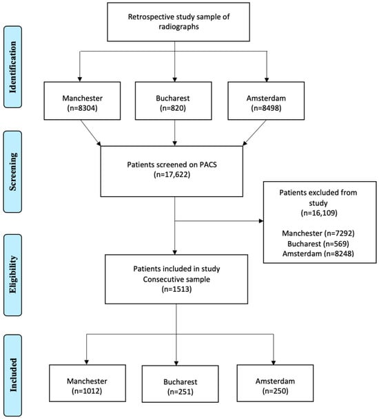 The study sample was retrospective in nature and composed of consecutive patients who had presented to these three dental hospitals, which are in three countries in Europe. The UK sample comprised patients who had attended the Manchester University NHS (National Health Service) Foundation Trust, University Dental Hospital, Manchester, UK, who had attended for routine examinations and who had undergone bitewing and periapical radiography. The investigators also had access to panoramic radiographs that had been taken for some of the included patients. The Romanian sample comprised patients who had self-referred to the Carol Davila Dental Hospital and had attended almost exclusively for private dental check-ups. For these patients, a combination of bitewing and periapical radiographs were available. Several panoramic radiographs had also been taken; these formed part of the locally provided oral assessment and dental check-up. The Netherlands patients had attended dental appointments for routine examination, mandibular third molar assessment or caries screening, and they had bitewing, periapical or panoramic radiographs taken. The researchers were calibrated before making assessments.