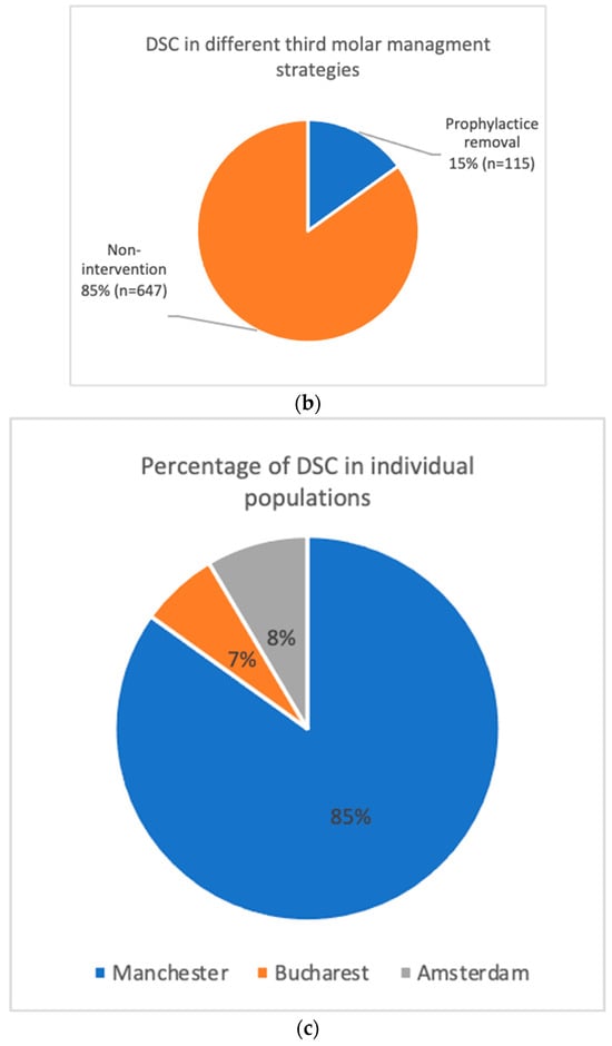 16]. This may have contributed to the fact that the lowest DSC rates were found in the Bucharest population. Furthermore, the patients seen in Bucharest and Amsterdam had lower average mDMFT-R percentage scores than those in Manchester, which indicated that they had, on average, better dental health than the patients from Manchester. However, we believe that these reasons do not entirely explain the 2.5 to 3.2-fold higher DSC rate in the Manchester study sample. While UK dentists adhere strictly to NICE guidelines, clinicians in Romania and the Netherlands discuss the consequences of third molar retention and the risk of DSC with patients, and in most cases, these discussions result in proactive third molar removal [