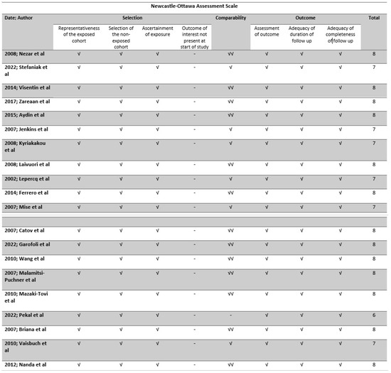 Newcastle–Ottawa scale (NOS) quality assessment of the included studies [9,10,11,12,13,14,15,16,17,18,19,20,21,22,23,24,25,26,27,28].√: the criterion under question is met, √√: two adjusting factors were taken into consideration.