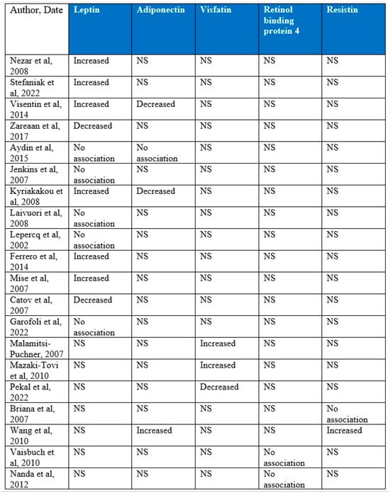 Summary of outcomes according to the adipokine investigated and the study included [9,10,11,12,13,14,15,16,17,18,19,20,21,22,23,24,25,26,27,28]. NS: not studied.