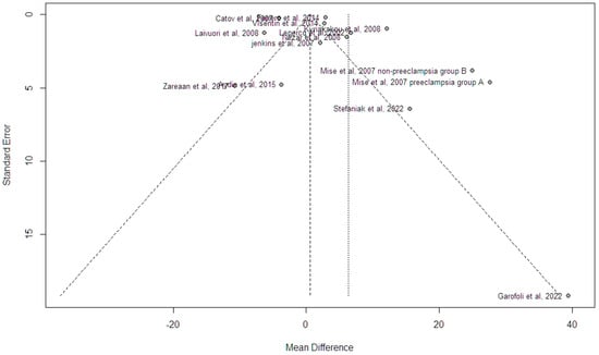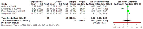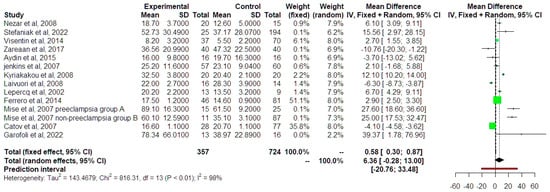 Leptin values were found to be increased in IUGR fetuses, although the actual result did not reach statistical significance (MD 7.88 ng/mL, 95% CI −0.03, 15.79, outcome from 13 studies, p = 0.0502) (Figure 4).
