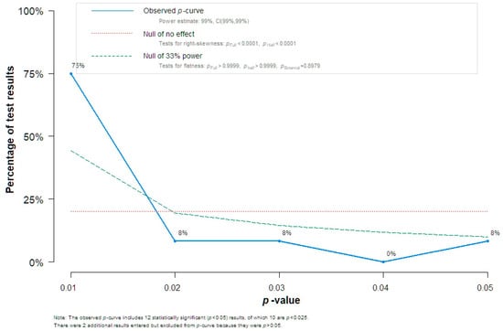 Funnel plot analysis indicated the absence of potential bias, and this was also supported by the Egger’s test analysis (intercept 0.3452, standard error 2.65, p = 0.311) (Figure 5. Given this discrepancy in the findings, we chose to perform the Trim n Fill analysis and observed that, with the addition of five hypothetical studies that would provide adequate symmetry to the funnel plot, differences in the summary estimate were non-significant (MD 0.74 ng/mL, 95% CI −7.50, 8.98, outcome based on 18 studies). A P-curve analysis of individual study effect estimates indicated the presence of evidential value, thus denoting the absence of p-hacking (Figure 6).