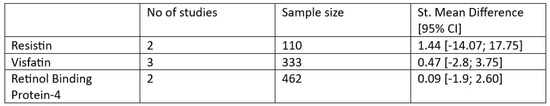 Data related to differences in visfatin, resistin, and RBP4 levels were extremely limited, and the meta-analysis that was performed did not reveal significant differences between IUGR fetuses and controls (Figure 8).