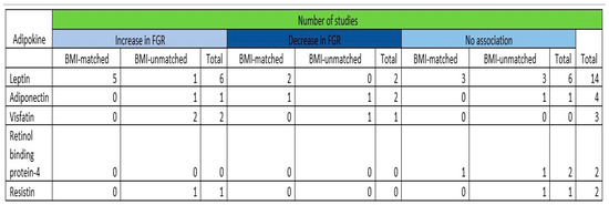 Overall, 20 studies were included in the present systematic review that included a total of 1850 patients. An overall summary of outcomes according to the adipokine investigated and the study included is presented in Figure 3. In terms of leptin, six studies revealed increased levels of the adipokine in pregnancies affected with growth-restricted fetuses compared to uncomplicated ones, two studies demonstrated decreased levels, and five studies revealed no association. In terms of adiponectin, decreased levels were demonstrated by two of the included studies, one study showed an increase in the levels of the adipokine, and one study concluded that no association could be revealed. Visfatin was investigated by three studies with two of them presenting increased levels in the affected cases, while one contradicted their results by demonstrating lower levels compared to the unaffected controls. No statistically significant differences were revealed between the affected and unaffected cases in terms of the levels of RBP-4 by the two studies that investigated a potential association. Resistin levels in growth-restricted fetuses were assessed by two studies with one revealing no differences while the other demonstrated increased levels in the affected pregnancies.