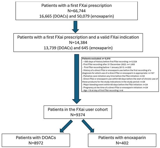 Out of 1.9 million patients of the BIG-PAC® database, a total of 66,744 patients received their first FXai prescription (16,665 taking DOACs and 50,079 taking enoxaparin), of whom 14,384 had a study indication (13,739 and 645, respectively). After excluding 5010 patients due to different reasons, 9374 patients were finally analyzed, with 8972 taking DOACs and 402 taking enoxaparin (only in active cancer patients) (Figure 1).