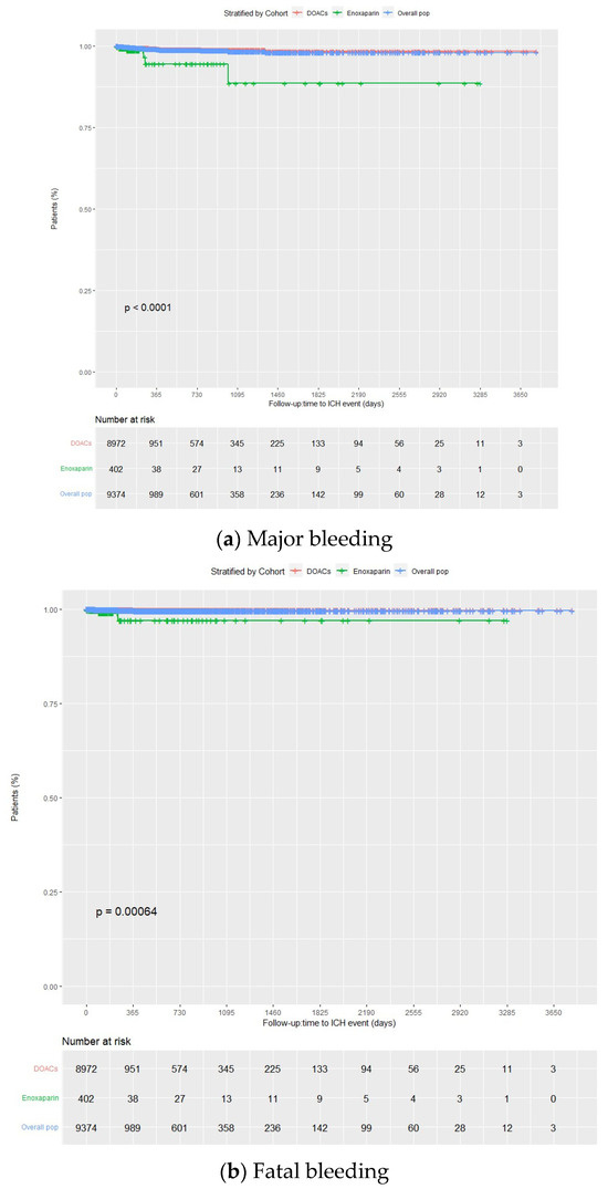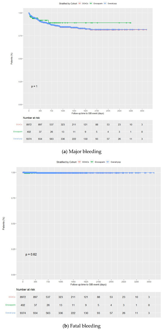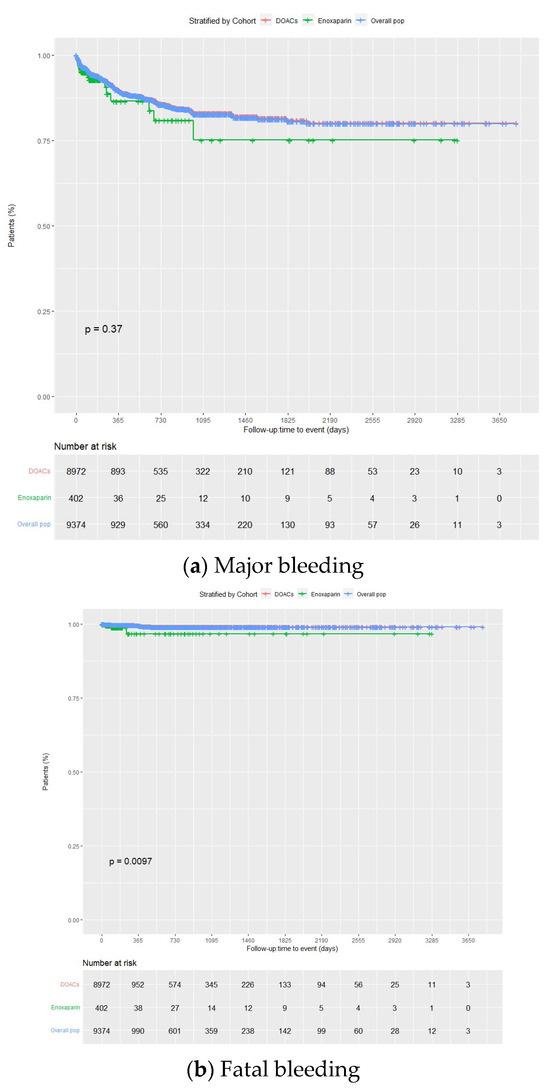 In addition, at the end of the follow-up period, among patients taking DOACs, the incidence rates of intracranial and gastrointestinal bleeding were 0.7 (95% CI 0.5–0.9) and 9.0 (95% CI 8.4–9.6) per 100 person-years, respectively. In the case of patients taking enoxaparin, these rates were 3.5 (95% CI 1.7–5.3) and 9.1 (95% CI 8.5–9.7) per 100 person-years, respectively. Whereas no significant differences were observed between enoxaparin and DOACs regarding gastrointestinal bleeding, major and fatal intracranial bleedings were more common with enoxaparin than with DOACs (p < 0.001 and p = 0.00064, respectively) (Figure 4a,b and Figure 5a,b).