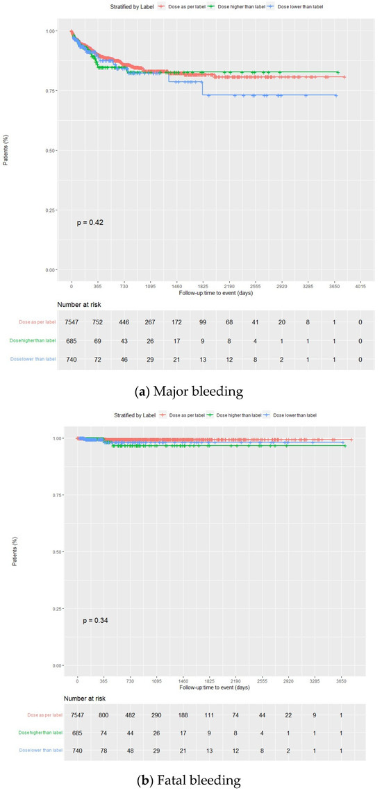 Kaplan–Meier curves for major and fatal bleedings for DOACs, according to label prescription. DOACs: direct oral anticoagulants.