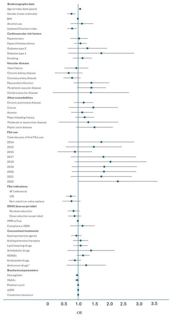 Risk factors for major bleeds for DOAC patients. * within 180 days prior to the index date. AF: atrial fibrillation; BMI: body mass index; DOACs: direct oral anticoagulants; eGFR: estimated glomerular filtration rate; FXai; Factor Xa inhibitors; MPR: medical possesion ratio; NSAIDs: non-steroidal anti-inflammatory drugs; OR: Odds Ratio; VTE: venous thromboembolism.