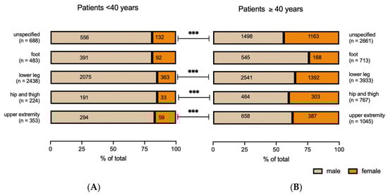 Number and % of total of compartment syndromes categorized by localization (foot, upper extremity, hip and thigh, lower leg, or unspecified location) and age of patients ((A): <40 years; (B): ≥40 years). χ2-test; *** p < 0.001.