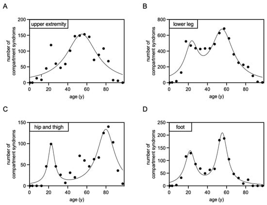 Non-linear regression analysis, employing Lorentzian distributions, was conducted on compartment syndrome cases following osteosynthesis between 2015 and 2022, categorized by the affected area ((A): upper extremity; (B): lower leg; (C): hip and thigh; (D): foot). The resulting graphs display the frequency of compartment syndromes in correlation with the patients’ ages.