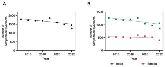 Compartment syndromes after osteosynthesis from 2015 to 2022. Linear regression function: y = −43.87x + 90,213; R2 = 0.5842; * significantly non-zero slope of the line, evidenced by an F-statistic of 8.429 and a p-value of 0.03 (A). Compartment syndromes after osteosynthesis from 2015 to 2022, categorized by patients’ sex (male and female). Linear regression function for males: y = −36.04x + 73,890; R2 = 0.6325; * significantly non-zero slope of the line, evidenced by an F-statistic of 10.33 and p = 0.02. Linear regression function for females: y = −7.83x + 16,323; R2 = 0.1147; slope of the line not significantly different from zero, evidenced by an F-statistic of 0.7774 and p = 0.41 (B).