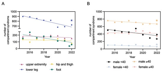 Compartment syndromes after osteosynthesis from 2015 to 2022, categorized by localization (foot, upper extremity, hip and thigh, lower leg). Linear regression function for the foot: y = −16.76x + 33,983; R2 = 0.5652; * significantly non-zero slope of the line, evidenced by an F-statistic of 7.8 and p = 0.03. Linear regression function for the upper extremity: y = −3.786x + 7816; R2 = 0.1794; slope of the line not significantly different from zero, evidenced by an F-statistic of 1.312 and p = 0.3. Linear regression function for the hip and thigh: y = −2.107x + 4377; R2 = 0.03103; slope of the line not significantly different from zero, evidenced by an F-statistic of 0.1922 and p = 0.68. Linear regression function for the lower leg: y = −32.87x + 67,143; R2 = 0.8277; * significantly non-zero slope of the line, evidenced by an F-statistic of 28.83 and p = 0.002 (A). Compartment syndromes after osteosynthesis from 2015 to 2022, categorized by patients age (<40 years and ≥40 years) and sex (male and female). Linear regression function for males under 40: y = −23.68x + 48,234; R2 = 0.501; * significantly non-zero slope of the line, evidenced by an F-statistic of 6.025 and p = 0.05. Linear regression function for males over 40: y = −12.36x + 25,656; R2 = 0.6429; * significantly non-zero slope of the line, evidenced by an F-statistic of 10.8 and p = 0.02. Linear regression function for females under 40: y = −5.750x + 11,691; R2 = 0.5522; * significantly non-zero slope of the line, evidenced by an F-statistic of 7.398 and p = 0.03. Linear regression function for females over 40: y = −2.083x + 4632; R2 = 0.01332; slope of the line not significantly different from zero, evidenced by an F-statistic of 0.08101 and p = 0.79 (B).
