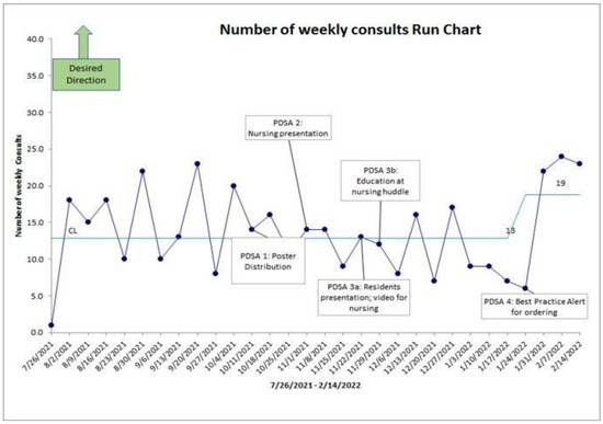 For the eight weeks prior to implementing the first PDSA cycle, there was an average of 15.5 referrals for all nonpharmacological pain management strategies. As observed within the annotated run chart (Figure 4), orders for nonpharmacological pain management strategies were low and inconsistent prior to the quality improvement project and change cycles. During the first three PDSA cycles, a similar pattern was noted. Following the first PDSA cycle, the average number of referrals received was 13.75 per week. Between cycles two and three, the average number of referrals per week was 12. Finally, between cycles three and four, the average orders received for nonpharmacological pain management strategies was 9.88 per week. During the process, it was observed that the first three cycles were primarily education focused. For the final change cycle, the focus of the BPA was to provide access to ordering the strategies. An average of 23 orders per week were received for nonpharmacological pain management strategies for the three weeks following the implementation of the BPA. This represents a 42% increase from baseline (using eight weeks) and a 50% increase in orders for nonpharmacological pain management strategies on average (using data following PDSA Cycle 1). Of note, there were no orders received for yoga during the entire length of the project.