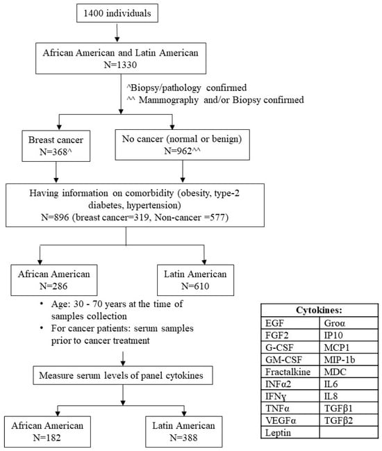 The inclusion/exclusion criteria were as follows. (a) Self-identified race/ethnicity: 31.9% were AA, and 68.1% were LA. Considering that the number of Caucasian and Asian participants was small and may not have generated meaningful statistical analysis, we only included AA and LA (Hispanic/Latin women) in this study. (b) Having information on comorbidity, i.e., obesity, T2D, and/or HTN. The comorbidity occurred before breast cancer diagnosis for women having breast cancer. (c) Breast cancer status was confirmed by the biopsy/pathology of the breast tissue, and only subjects who had documentation of this information were included in the study. Non-cancer controls included healthy women who came for routine mammogram checking, had breast lumps, and ruled out malignancy. (d) Baseline blood sample (serum sample collected at the time of diagnosis and before cancer treatment for breast cancer). We selected (e) those aged 30–70 years at the time of blood sample collection to assess levels of panel cytokines. A total of 570 women who fulfilled our inclusion criteria and their serum level of panel cytokines were obtained successfully.