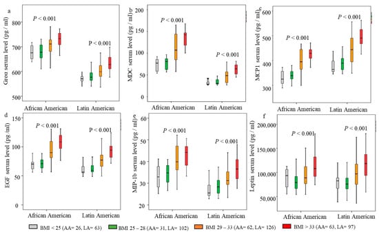 Association of cytokines with body mass index (BMI) in African American (AA) and Latin American (LA) women. The cohort was stratified according to BMI and ethnicity. BMI and ethnicity clustered Boxplot. The predicted levels of cytokines and Leptin from each linear regression model were log (10) transformed, and the geometric median (solid line), interquartile ranges (box), and outliers (vertical line) were presented in each BMI group in AA and LA, respectively. (a) Groα serum levels, (b) MDC serum level, (c) MCP1 serum level, (d) EGF serum level, (e) MIP-1b serum level, (f) Leptin serum level. Kruskal–Wallis one-way ANOVA tests were used to determine the statistical differences; p < 0.05 was considered statistical significance.