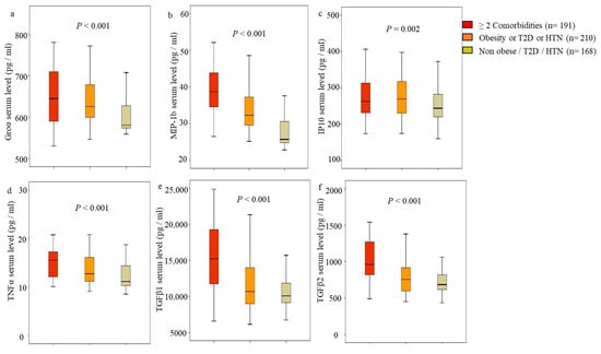 Association of breast cancer-associated cytokines and comorbidities. African American and Latin American women were stratified into three groups according to comorbidities: (1) those who have two or more comorbidities (obesity, type-2 diabetes (T2D), hypertension (HTN), (2) those who have obesity or T2D or HTN (signal condition), and (3) those with nonobesity/T2D/HTN. The predicted levels of the indicated cytokines from the regression model were anti-log (10) transformed, and Boxplots were made. The geometric median (solid line), interquartile ranges (box), and outliers (vertical line) were presented according to the number of comorbidities. (a) Predicted Groα serum levels, (b) predicted MIP-1 level, (c) predicted IP10 level, (d) predicted TNFα level, (e) predicted TGFβ1 level, (f) predicted TGFβ2 level. The significant differences among groups were determined by Kruskal–Wallis one-way ANOVA. p < 0.05 was statistically significant.