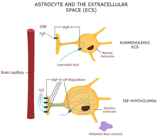 Astrocytes contact cerebral microvessels with their end-feet processes, delineating a pathway for the flow of extracellular fluid, known as the glymphatic system. The volume of interstitial fluid (ISF) in the brain parenchyma varies with the brain work. During high intensity work, AQP-4 water receptors are upregulated in the end-feet, pumping the ISF into astrocytes. This results in low ISF (hypovolemia). During sleep (low-intensity brain work), less ISF enters the astrocyte. The circulation of ISF clears the molecular debris (including beta amyloid) from the extracellular space.