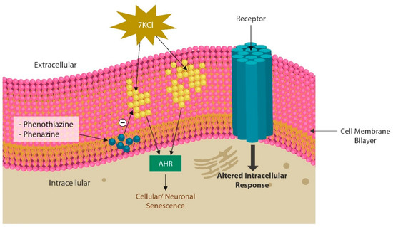 The lipid bilayer of neuronal membrane is easily oxidated when intracellular iron is upregulated. Oxysterols, including 7-Ketocholesterol (a toxic oxide), and oxidated phospholipids alter the biophysical properties of cell membranes, disrupting neurotransmission. In addition, oxidized lipids activate AhR, triggering premature neuronal senescence. Phenazines, phenothiazines, and their derivatives, intercalate themselves into the lipid bilayer, repairing the lipids in cellular and/or mitochondrial membranes.