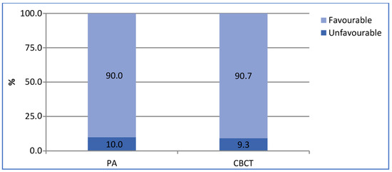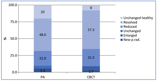 The percentage of favourable outcomes was almost identical for CBCT and PA. However, only 93 out of 150 teeth showed the same outcome with PA and CBCT, with higher numbers of “resolved radiolucencies” detected with CBCT and a higher number of “unchanged healthy” teeth detected with PA. This is clearly due to the higher sensitivity of CBCT in detecting apical radiolucencies, as demonstrated in a histology study [27]. PA radiographs are the method of choice for the assessment of the outcome of surgical endodontics. The results obtained using PA radiographs were reported, as this may help in understanding to what extent periapical radiographs underestimate the presence of apical periodontitis in teeth endodontically treated and also in teeth treated with surgical endodontics.