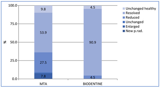 The high success rate of surgical endodontics employing modern techniques such as operative microscopes, ultrasonic apical preparation, and MTA/calcium silicate cement as retrofilling material has been previously reported using periapical radiographs [17,18] and CBCT [19]. To the authors’ knowledge, this is the first apical surgery CBCT study in which different retrofilling materials have been compared. Considering that there was no significant difference between the three root-filling materials in terms of “healing” radiolucencies, the higher proportion of complete healings observed with Biodentine is likely to indicate a “faster healing” potential. This may well be associated with the intense production of calcium silicate hydrate and calcium hydroxide that has been observed with this calcium silicate cement [20], which is known to have a better seal than other materials when used in a liquid-rich environment, as addressed by previous studies [21]. To the authors’ knowledge, this is also the first independent clinical investigation on Biodentine as a retrofilling material. Biodentine is routinely used by many general dental practitioners and endodontists for its effectiveness in pulp capping and pulpotomy, open apices obturation [22,23,24], and perforation repair [25]. However, Biodentine is less popular as a retrofilling material due to its lower radiopacity compared to MTA and other calcium silicate materials [26].