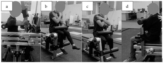 The knee flexor and extensor torque of the dominant limb were also tested in the sitting position, with the hip and knee joints at 90° of flexion. The subjects were stabilized by a close-fitting roller at the level of the anterior iliac spine at the proximal part of the thigh and posteriorly at the lumbar spine. The upper limbs were crossed over the chest (Figure 2b,c). The trunk flexors and extensors were tested in the sitting position and the estimated axis of rotation at the hip coincided with the axis of rotation of the torque meter lever. The participants were also stabilized by a roller at the level of the proximal part of the thigh with the upper limbs crossed over the chest (Figure 2d).