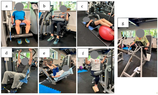 Resistive training (RT) aimed at improving muscle strength was conducted in the Zdrofit Gym Warsaw-Bielany twice a week, for 60 min per session and for 8 weeks, according to the recommendations of World Physiotherapy (World Physiotherapy, 2021 and NICE, 2020) [24]. The protocol was developed by a team of physicians, specialists in physiotherapy and resistance training coaches. Before every session, participants’ heart rate, blood pressure and oxygen saturation were measured. If they had a blood pressure of >160/100 mmHg or a heart rate (HR) > 100 or <50 beats per minute, participants were not allowed to do exercises during that session.