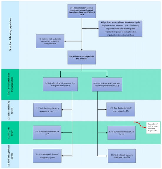 Therefore, this study aimed to investigate the impact of post-transplant MS present 1 year after liver transplantation on mid- and long-term survival rates, risk of major CVEs, and de novo malignancies in deceased-donor-liver recipients. Donor-, recipient- and procedure-related variables were also examined in an attempt to identify independent predictors of major CVEs and malignancies, as well as overall post-transplant mortality in the long term.