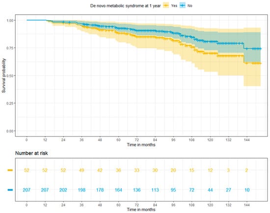 During the median follow-up of 89 months, cumulatively, 38 deaths occurred (14.7%): 11 (21.1%) in the group with post-transplant MS and 27 (13%) in the group without the condition. Infections, de novo malignancies, and CVDs were the most frequent causes of death in both groups (Table 3). COVID-19 led to fatal outcomes in one and two patients with and without new-onset MS, respectively.