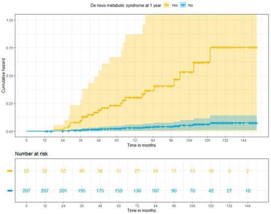 MS constitutes a well-established factor fuelling the development of atherosclerotic CVDs and is known to increase the risk of major cardiovascular events (CVEs) and overall CV mortality in liver recipients [,]. Outside of CV-related mechanisms, the adverse impact of MS on survival is multiplied by its noxious effect on the promotion of steatosis and fibrosis of the allograft [,]. Additionally, MS and each of its constituents entail structural and functional changes in the kidneys, leading to the development of chronic kidney disease and favour disease progression. The underlying mechanisms of MS-associated kidney injury are complex and include, among others, insulin resistance and excessive accumulation of adipose tissue. This, in turn, promotes oxidative stress and a state of chronic inflammation, which elicit renal damage through exacerbation of pre-existing insulin resistance, activation of the renin-angiotensin-aldosterone system, alteration of endothelial function and adipocytokines imbalance [,]. Infection with or reactivation of oncogenic viruses, chronic antigenic stimulation leading to a cytokine-rich milieu, and chronic state of immunosuppression are the main mechanisms responsible for de novo carcinogenesis in the post-transplantation setting. Individual risk factors related to patient demographics, behavioural factors (alcohol and/or tobacco use), underlying liver disease and oncological status (malignant condition present at the time of transplantation or history of the malignant condition) are also known to contribute to carcinogenesis []. However, little is known about the impact of post-transplant MS on the risk of de novo malignancies in liver recipients.
