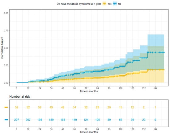 Adjusted cumulative risk of de novo tumours among patients with or without post-transplant metabolic syndrome at 1 year (log-rank p = 0.198).