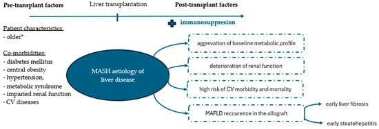 Metabolic profile of liver recipients with underlying metabolism-associated steatohepatitis (MASH). *As compared to patients transplanted for other indications. Abbreviations: CV, cardiovascular; MAFLD, metabolic dysfunction-associated liver disease.