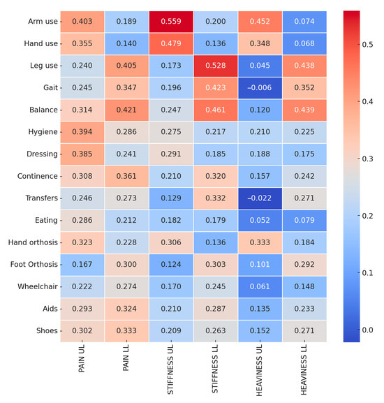 Our findings revealed significant correlations between unpleasant sensations in the limbs and the functional capabilities of individuals, with self-care activities being notably affected by these sensations. The correlation between upper limb unpleasant sensations and activities of daily living has substantial implications for patient care. In fact, in each of these domains, hygiene, dressing, eating, and continence—Unpleasant sensations are not just symptoms but a considerable barrier to independence and quality of life. Pain in the upper limbs showed a stronger correlation than stiffness and heaviness with both hygiene and dressing, suggesting that the experience of pain can severely hamper one’s ability to maintain personal cleanliness and attire independently [50]. The act of dressing involves a complex range of motions and fine motor skills, and pain can disrupt this delicate coordination [51], leading to reliance on assistance from caregivers or adaptive devices. Therefore, effective pain management is central to rehabilitation efforts that aim not only to alleviate discomfort but also to restore functionality and independence in daily living tasks [52].