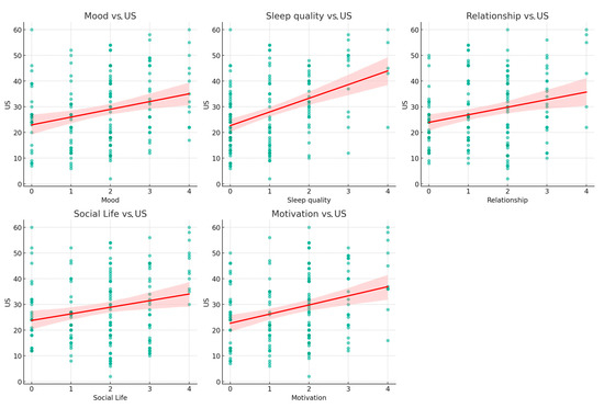 The Spearman correlation coefficient between ‘Mood’ and ‘US’ was found to be r = 0.260, indicating a positive correlation (p = 0.0093). A stronger positive correlation was noted between ‘Sleep quality’ and ‘US’, with an r = 0.461, which was highly significant (p < 0.001). Similarly, the correlation between ‘Relationship’ and ‘US’ was modest but significant (r = 0.295, p = 0.0030). The association between ‘Social Life’ and ‘US’ also showed a modest positive correlation (r = 0.276, p = 0.0056). Lastly, ‘Motivation’ was positively correlated with ‘US’ (r = 0.324, p = 0.0011).