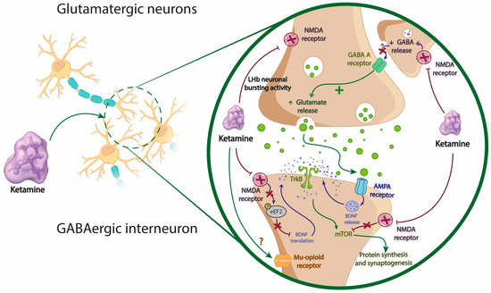 Although it should be noted that there is great variability (29–90%) in the number of patients responding to ketamine in the short term and concerns about long-term safety and tolerability require further investigations, in recent years the use of ketamine as an antidepressant has significantly increased, particularly in private clinics [51]. In this scenario, ketamine has been a remarkable discovery, not only due to the characteristics of its antidepressant effect but also because of the novelty of the proposed mechanism of action, as ketamine is not a monoaminergic antidepressant but rather an NMDA receptor antagonist that acts on various neuronal pathways including the opioid, monoaminergic, glutamatergic, and muscarinic systems, as well as substance P and sigma receptors [52]. NMDA receptors are heterotetramers that act as ion channels. Their activation requires the simultaneous binding of L-glutamate and glycine/D-serine to the GluN2 and GluN1 subunits, respectively, as well as the voltage-dependent displacement of Mg2+ from the ion channel pore, resulting in the entry of calcium into the neuron [53]. Several hypotheses have been described regarding the mechanism of action of ketamine and its metabolites, including direct action on NMDA receptors in glutamatergic neurotransmission, inhibition of NMDA receptors in GABAergic neurons, and energy metabolism [54]. The direct inhibition of extrasynaptic NMDA receptors causes the selective blockade of NMDA receptors containing extrasynaptic Glu2B, which are activated when there are low levels of environmental glutamate regulated by the glutamate transporter 1 (GLT-1) located in astrocytes. Ketamine’s inhibition of these receptors can activate mammalian targets of rapamycin (mTOR), which in turn induces protein synthesis. It has also been proposed that blocking the spontaneous activation of NMDA receptors by ketamine results in the inhibition of eukaryotic elongation factor 2 kinase (eEF2K) activity, thereby preventing the phosphorylation of its substrate, eukaryotic elongation factor 2 (eEF2). This ultimately leads to increased translation of BDNF, promoting protein synthesis and synaptogenesis. Importantly, while ketamine is a fast-acting antidepressant with long-lasting effects, its elimination half-life is short. In this regard, it has also been demonstrated that ketamine directly inhibits excessive NMDA receptor-dependent activity of lateral habenula (LHb) neurons associated with depressive symptoms [55]. Moreover, a recent study shows that the antidepressant effect is due to the use-dependent trapping of ketamine in NMDA receptors, making for significant progress in the understanding of the mechanism of action of new antidepressant agents [56].