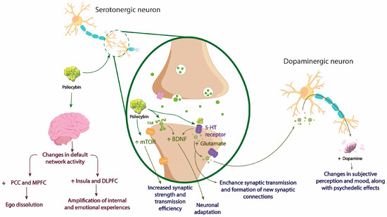 Representation of the mechanism of action of psilocybin. Psilocybin influences brain activity by modulating its networks activity, increasing some while decreasing others. Notably, it decreases activity in the PCC and MPFC, while elevating in the insula and DLPFC. Consequently, this process induces ego dissolution and intensifies internal and emotional experiences, respectively. It also binds to 5-HT receptors, leading to increased glutamate levels. This elevation in glutamate enhances synaptic transmission and promotes synaptic plasticity. Additionally, it also activates BDNF and mTOR second messengers’ pathways, inducing the neuronal adaptation and the incrementation of synaptic strength and transmission efficiency. Likewise, TrkB is activated, leading to an increase in BDNF release. Furthermore, heightened glutamate release stimulates dopamine release in dopaminergic neurons, eliciting mood changes and psychedelic effects. BDNF: brain-derived neurotrophic factor; DLPFC: dorsolateral prefrontal cortex; mTOR: mammalian target of rapamycin; MPFC: medial prefrontal cortex; PCC: posterior cingulate cortex; TrkB: tropomyosin receptor kinase B; 5-HT: serotonin.